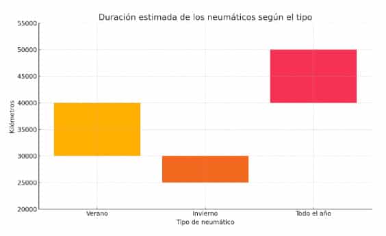 El gráfico muestra el rango de kilometraje estimado para tres tipos principales de neumáticos: de verano, de invierno y todo el año. Se observa que:
