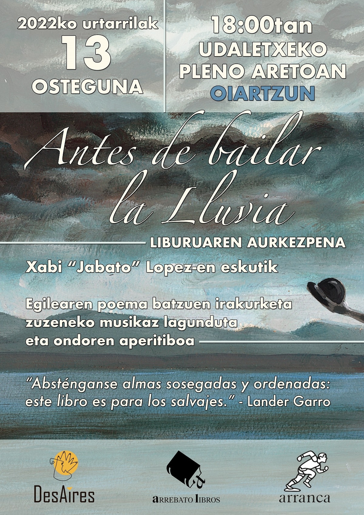 El escritor y polifacético artista Xabi ‘Jabato’ Lopez presentará el 13 de enero su libro de poesía ‘Antes de bailar la Lluvia’ en el Ayuntamiento de Oiartzun a las 18 horas.
