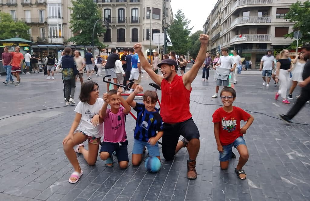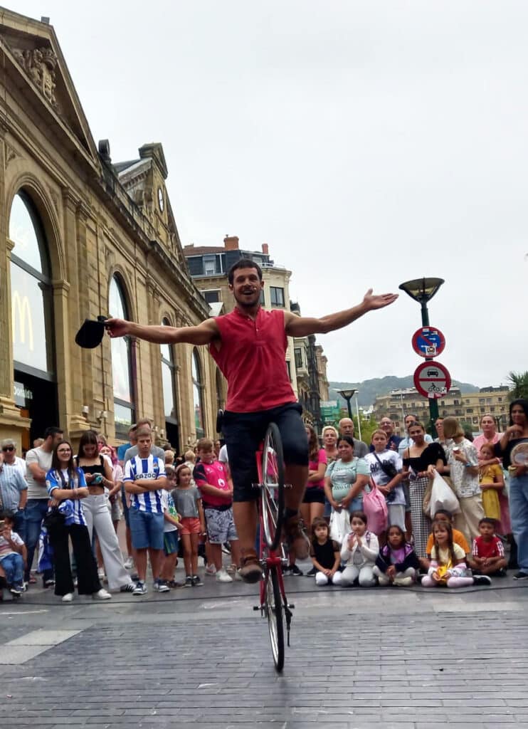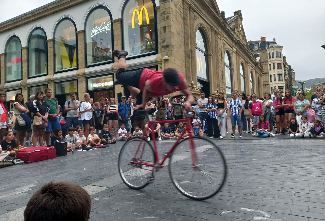 Tanto en la Zurriola como en el Boulevard se lució sobre su bici, pero además de sorprender con su habilidad también logró muchas risas interactuando con el público.